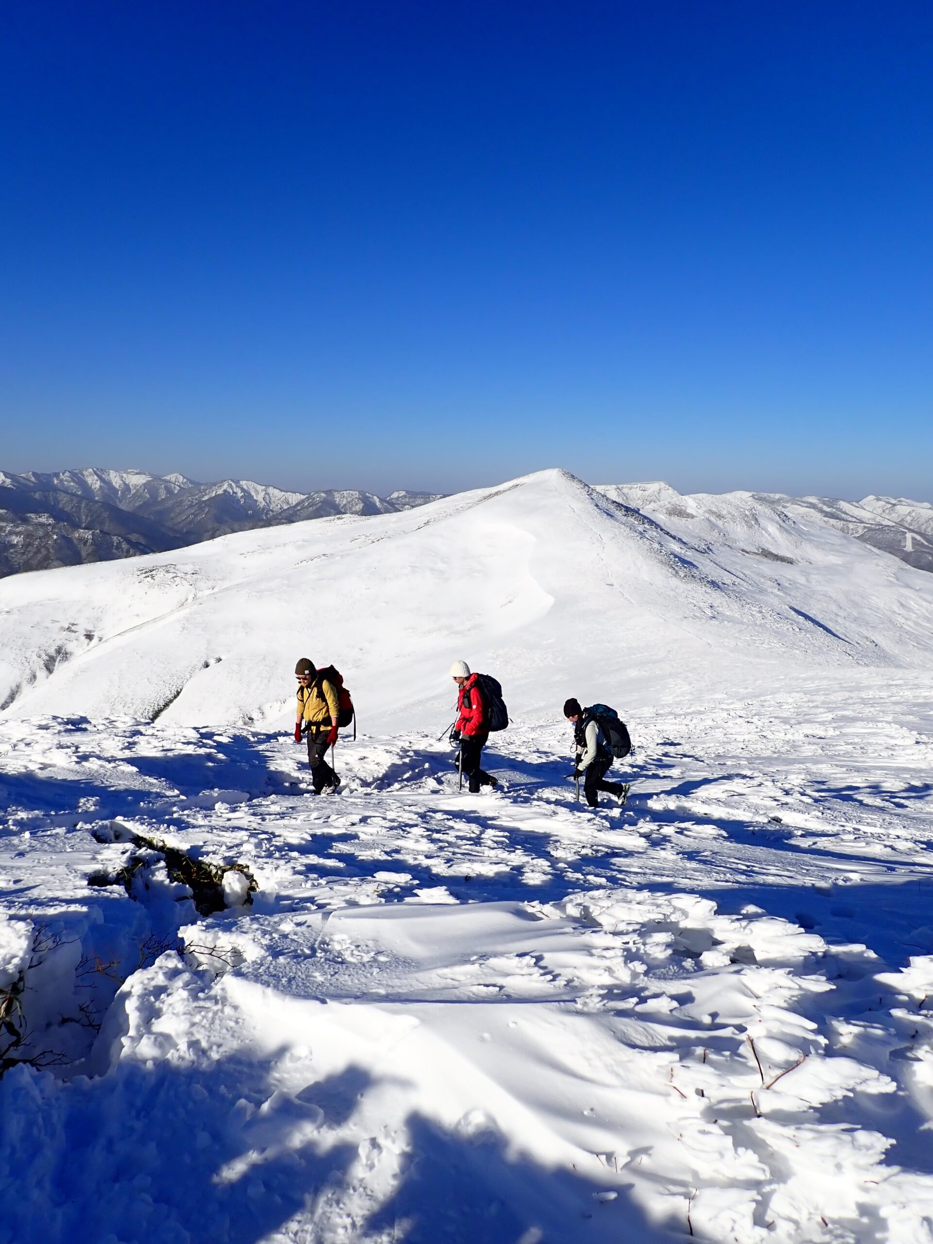 谷川連峰最高峰・仙ノ倉山に平標山から登頂しました。実は、この時期、西高東低の気圧配置の下で、新潟県から群馬県、つまり日本海から太平洋へと吹き抜ける冬型の爆風の中で、二回ともコルで吹き飛ばされて敗退の憂き目を見ていますが、今回は移動性高気圧の下、二日間、雲一つない微風の快晴の下、真っ白な二つの山に登れました。稜線はエビノシッポと霧氷がビッチリ。夢の世界の雪山でした。