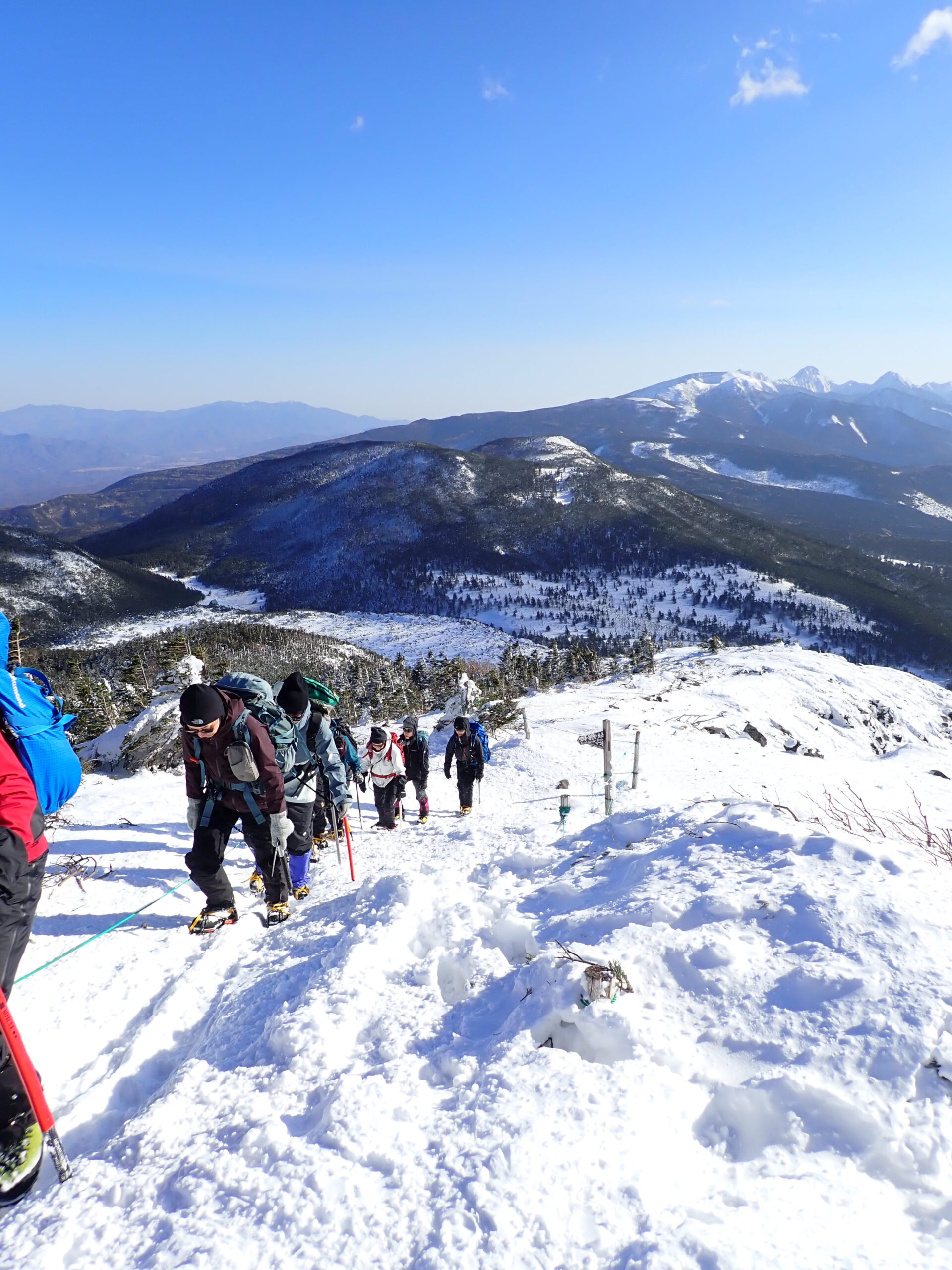 これから雪山登山を始める方のための「体力も根性もないけど雪山初体験」北横岳と三つ岳・・・は、雪山初体験者5人をサポートメンバー5人で靴の履き方、ピッケルの持ち方から講習しました。暖かく、真っ青な空で風は強いものの「初体験」にはピッタリの状況でした。新しい雪山登山者が誕生した一日でした。