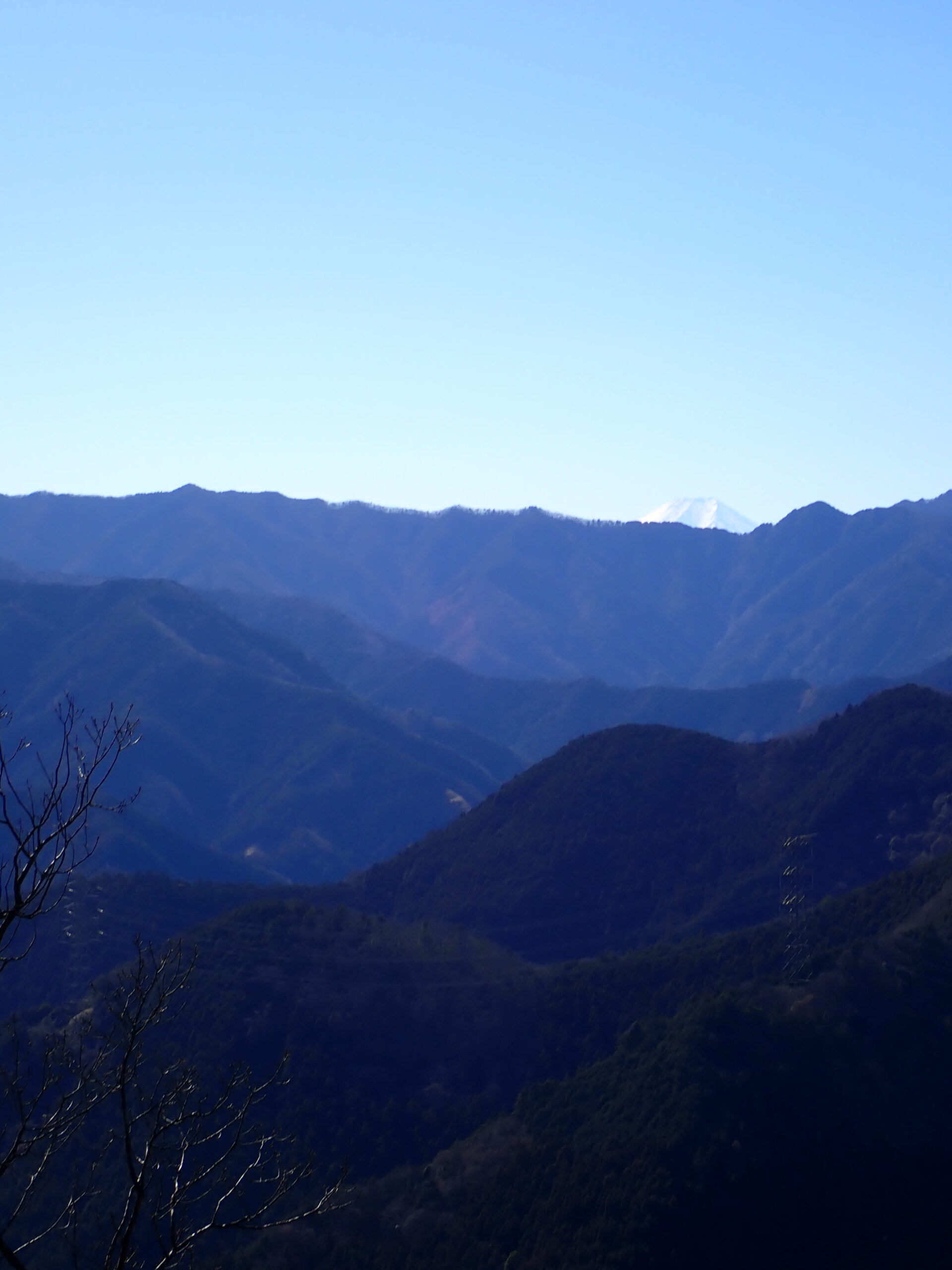 軍畑駅からの山麓の道はロウバイが甘い香りを漂わせていました。高水山から岩茸石山へは冷たい冬の風が吹き抜け、奥武蔵の山の向こうには日光白根が見えます。名坂峠への急峻な下り、次々と現れる小ピークを越えてやがて広葉樹の森が増え、途中からは奥多摩主脈の上に頭だけ真っ白な富士山が顔を出します。最後の登りを制して立った棒ノ折山からは奥多摩の山と東京の市街地が大きく見えました。雲一つない快晴の一日でした。