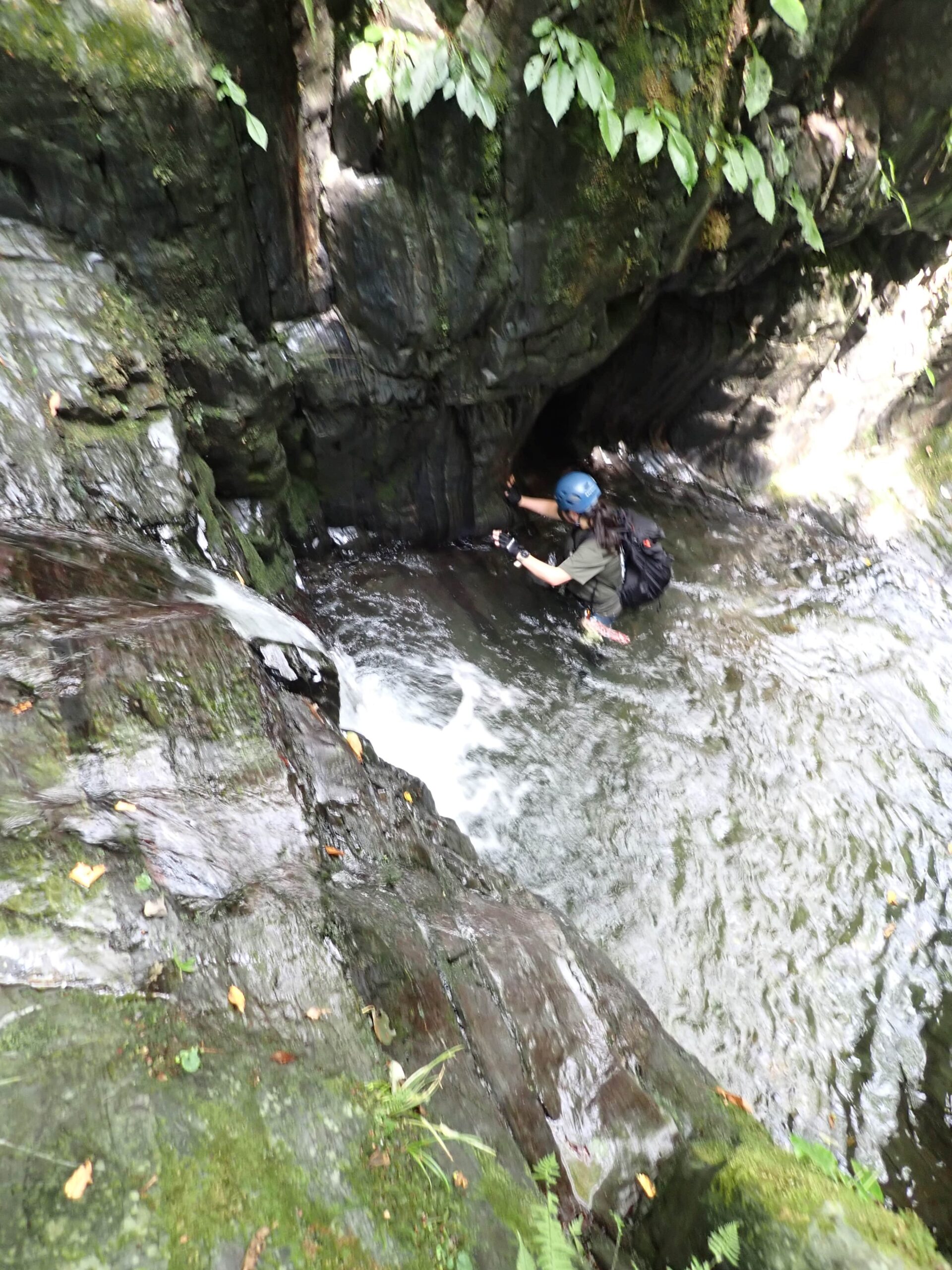 「やまあるき」の沢登り、奥多摩南秋川小坂志川に行ってきました。日本庭園を思わせる美しい縞模様の沢床と足元を走り回るイワナ。苔むした沢を遡行しました。炭焼き窯やワサビ田跡のある、山里の沢でした。