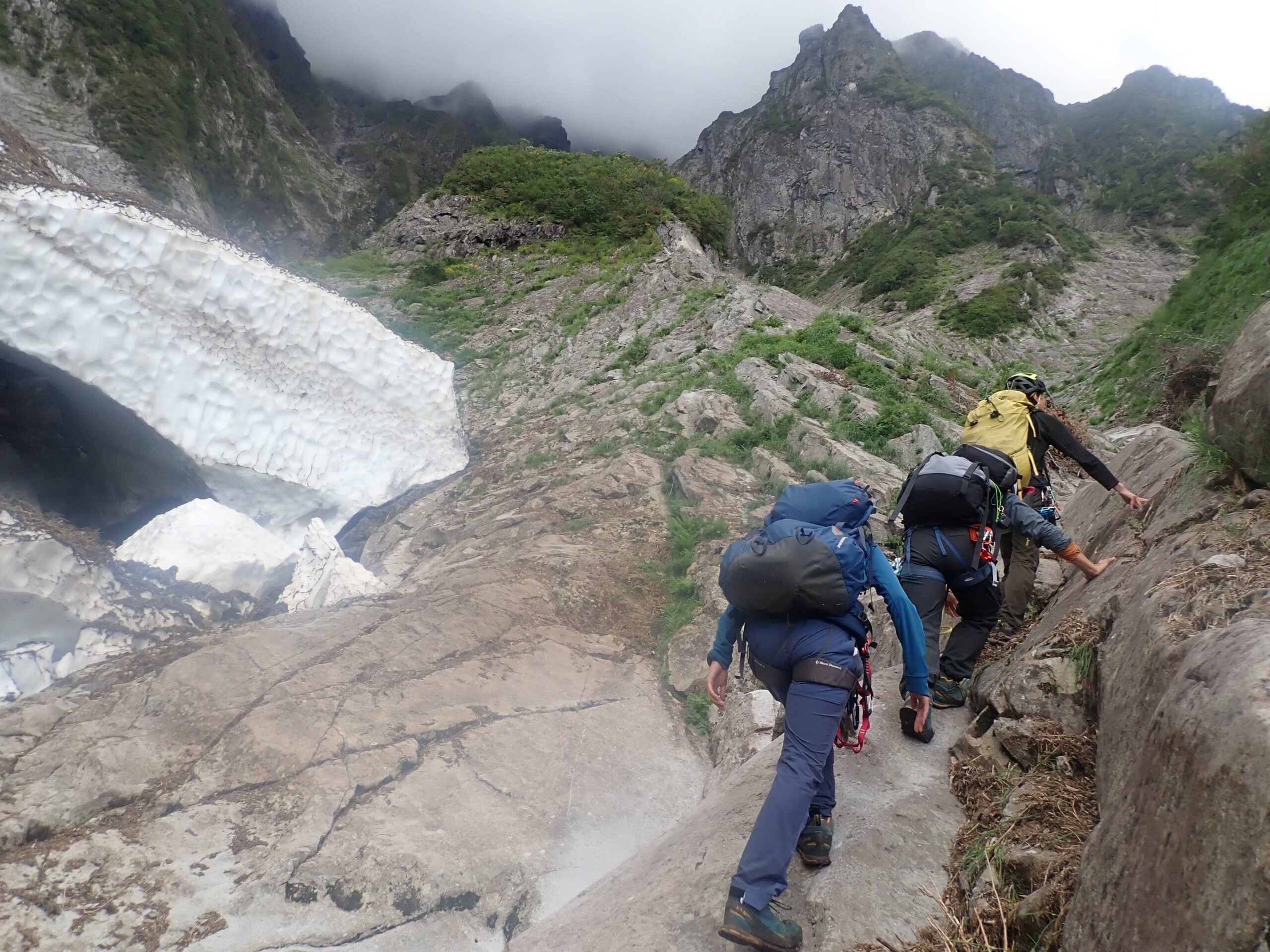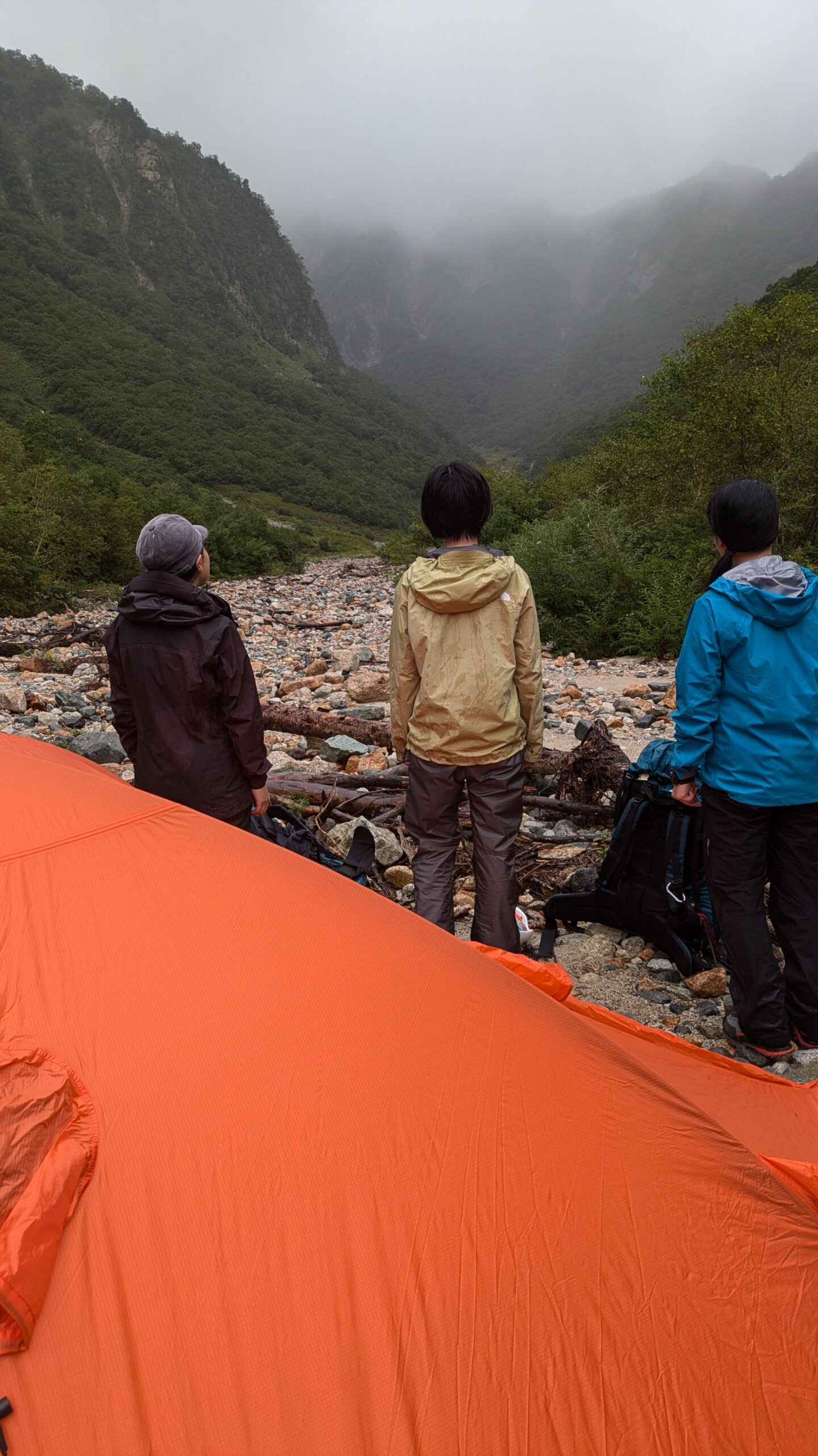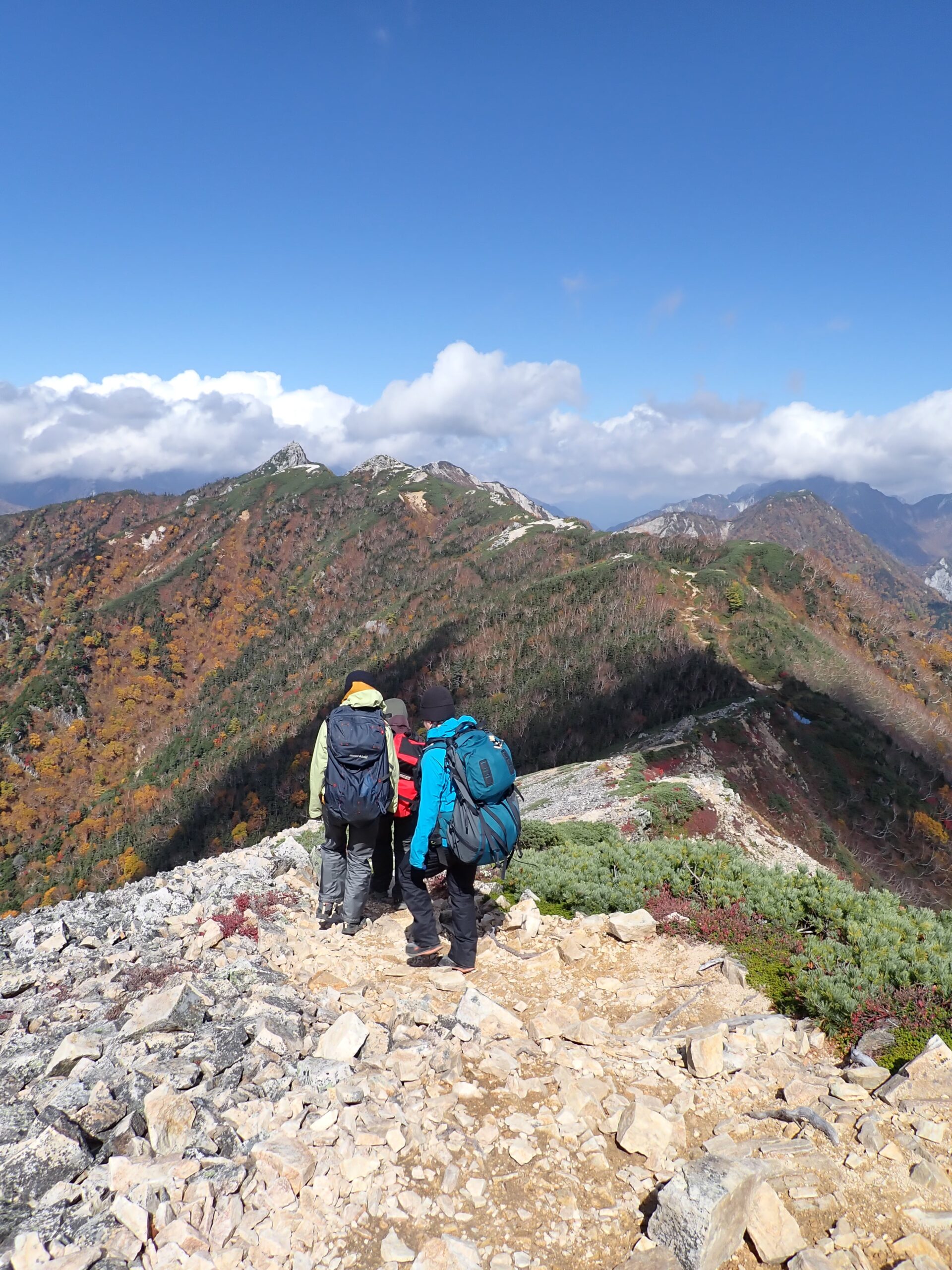 秋雨が降り続ける高瀬ダムから「三大急登」・ブナ立尾根に取り付き、積雪期をイメージしながらピンクテープを取り付けていきます。傾斜は厳しくても古くからの登山道は登りやすく烏帽子小屋近くのテント場に泊まります。明け方まで雨が降り続き、ヘッドランプで出発すると強い風の中、黒部源流の山々が見渡せます。穏やかな山容の野口五郎岳に立ち、正月の再訪を誓いました。